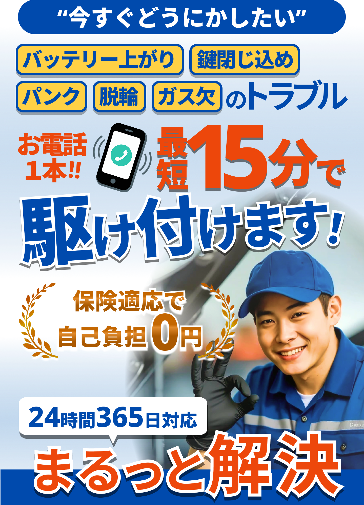 バッテリー上がり・鍵閉じ込み・パンク・脱輪・ガス欠のトラブルに 24時間365日対応・最短15分で駆け付けるロードサービス